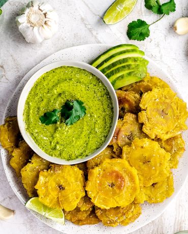 Twice-fried plantains with vibrant cilantro-lime mojo dipping sauce